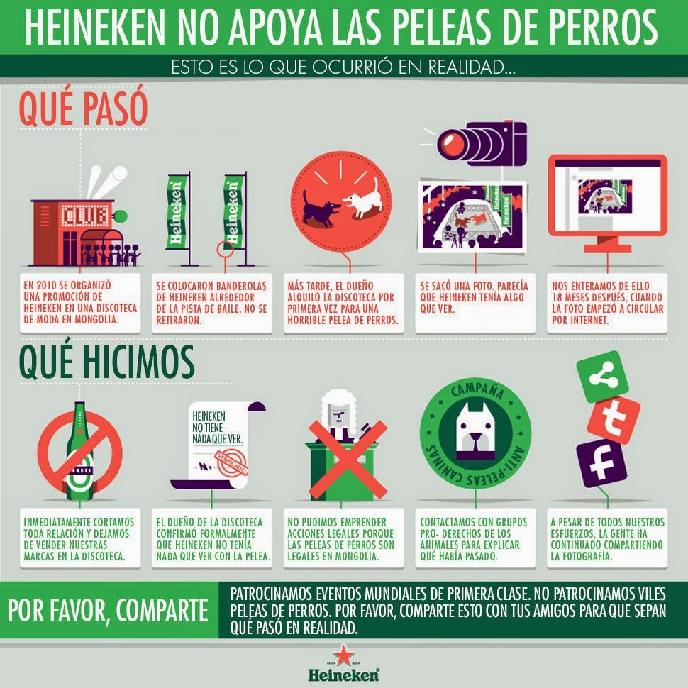 Este es un ejemplo que ya tiene algunos años (2010), pero muestra la clara respuesta de la marca Heineken ante una (falsa) acusación de apoyar peleas de perros:
